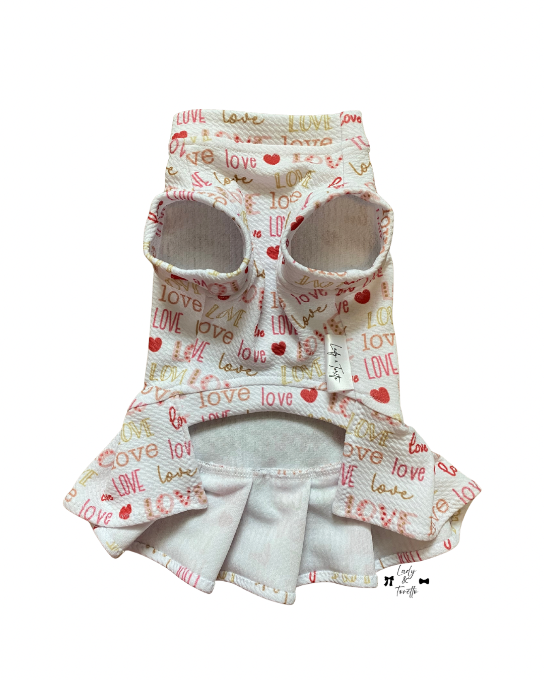 Cute LOVE-Filled dress. Comfortable for all day wear. Ideal for photos. Made from a polyester and spandex blend.