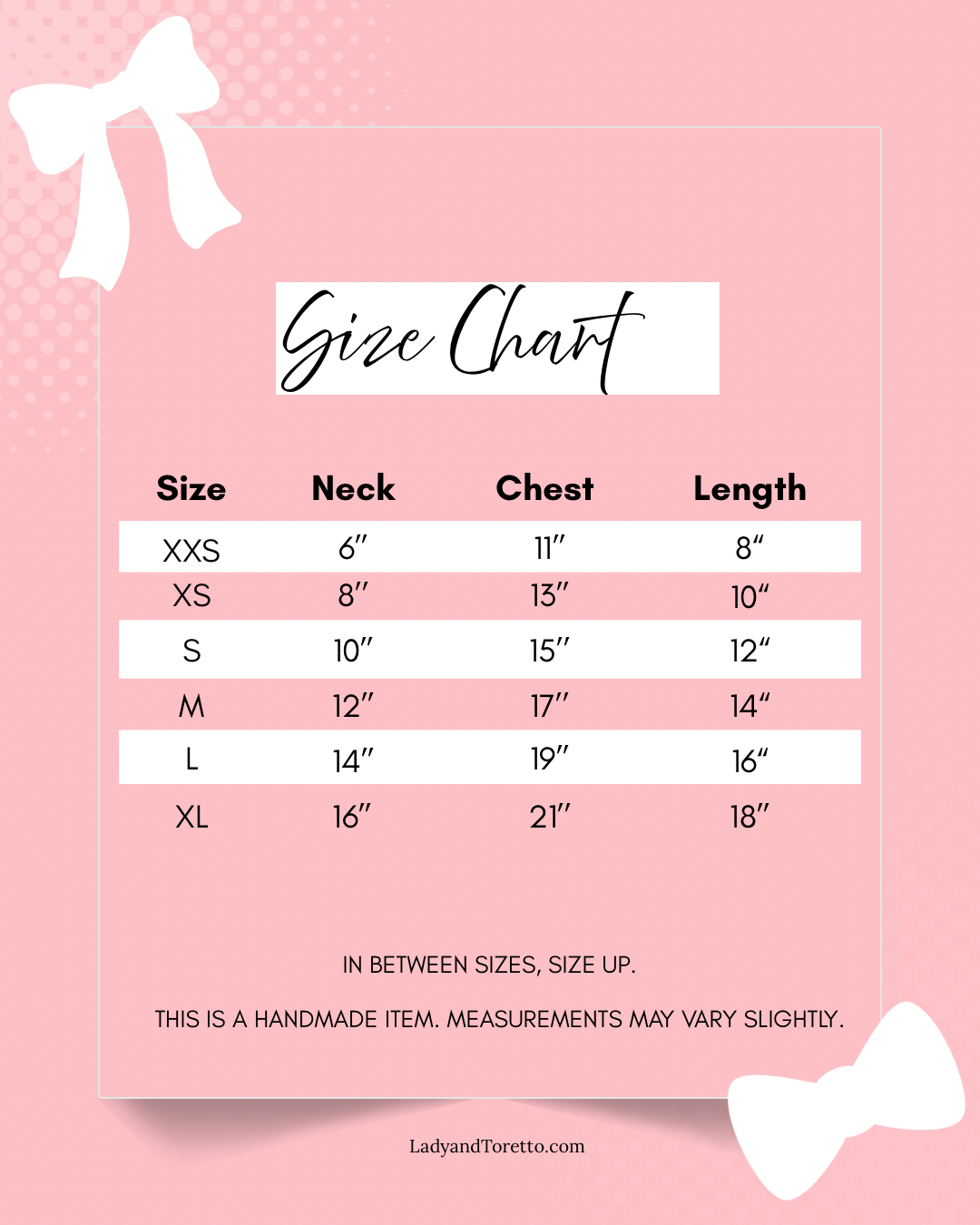 Each item is made to order. Measurements may vary slightly.